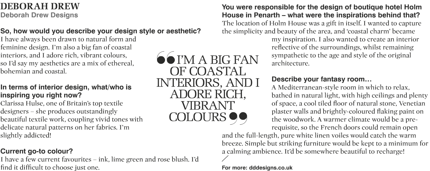The Summer 2016 issue of Cardiff Life features an interview with Deborah Drew and four other interior designers on their inspirations, go-to colours and fantasy rooms…